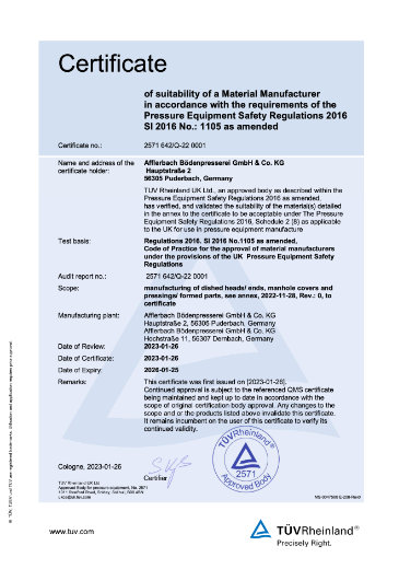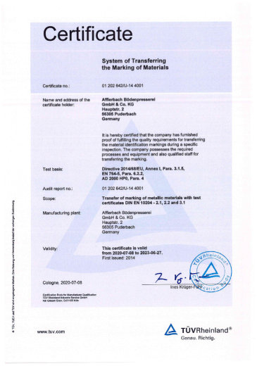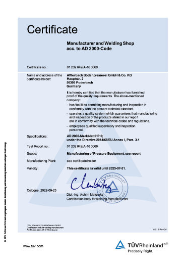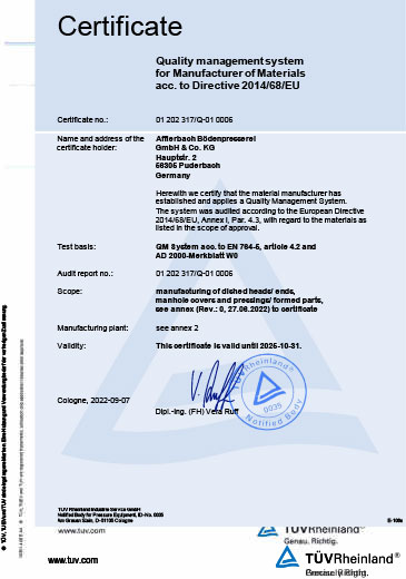 • TÜV-CERT certificate Reg. no. 01 100 83057 acc. to DIN EN ISO 9001:2008 and EU-Directive 2014/68/EU